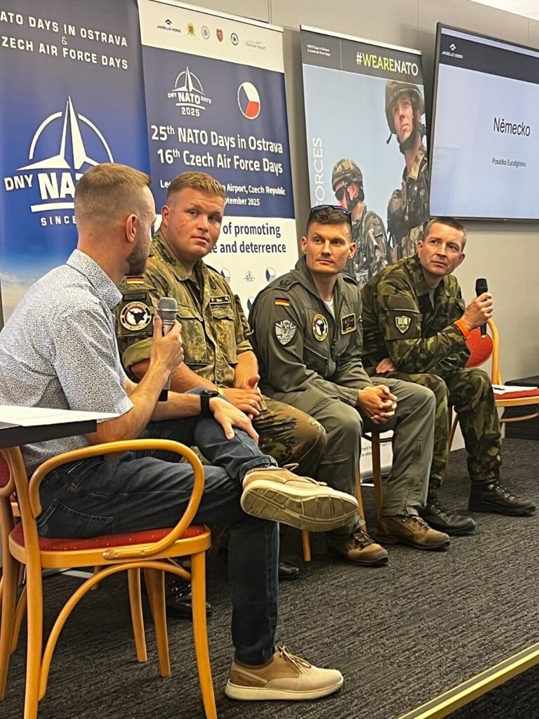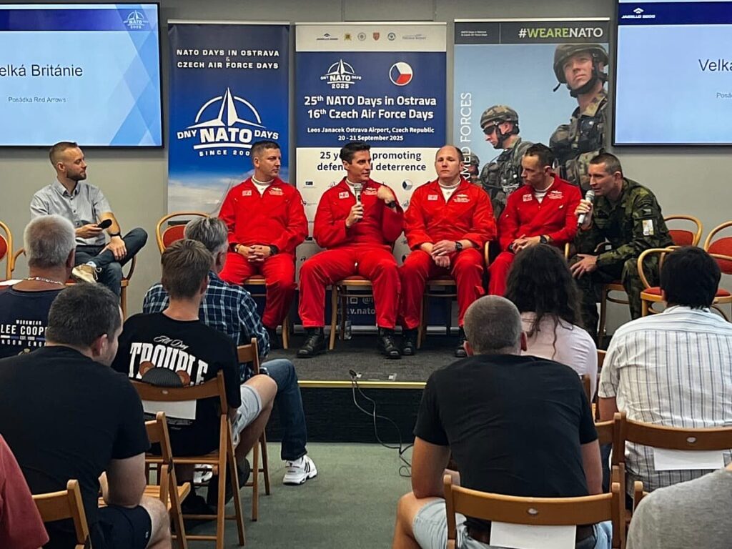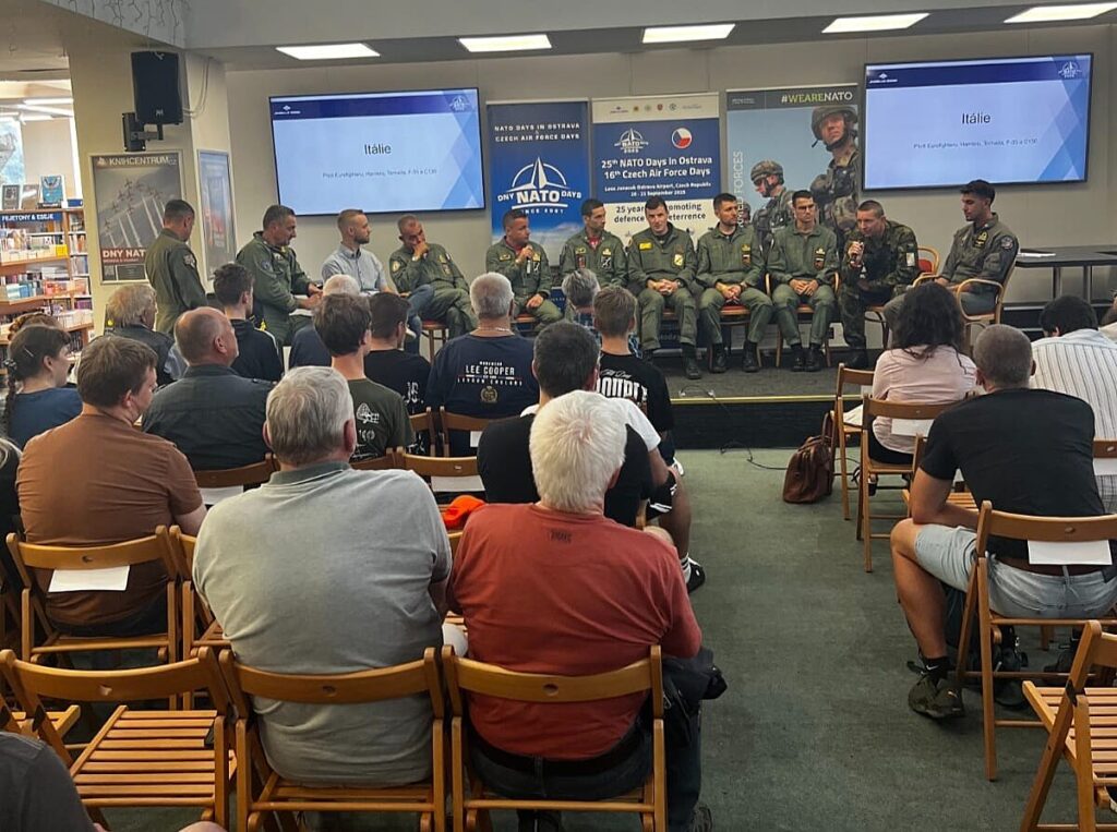 As part of NATO Days in Ostrava & Czech Air Force Days, the NATO Information Centre prepared its annual informal public discussion with participants of the event. This year, the Ostrava Knihcentrum (House of Books) hosted members of the Red Arrows, pilots of the Italian Air Force and Navy (operating Eurofighter, Tornado, F-35, Hercules and Harrier aircraft), the German Air Force (Eurofighter), and a representative of the US Army with Czech roots. The event was supported by the PPF Foundation.