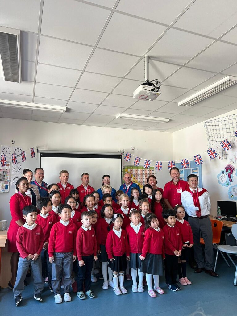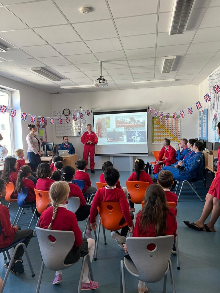 Piloti a další členové týmu Red Arrows navštívili PORG International School Ostrava, kde žákům prvního stupně představili svou práci, děti jim na oplátku ukázaly svou namalovanými letadly vyzdobenou školu.